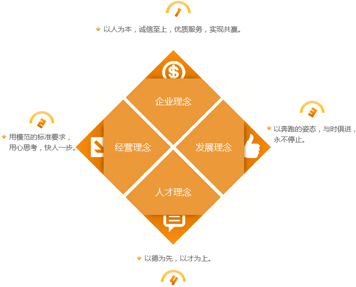 回報社會、構(gòu)筑和諧。服務人民大眾,振興民族經(jīng)濟;質(zhì)量是企業(yè)的生命;顧客是完美的衣食父母;遵守國家法律,弘揚法制精神,伸張社會正義,爭做守法公民;爭創(chuàng)效益,回報社會;以人為本,以才興企,廣納賢才。
